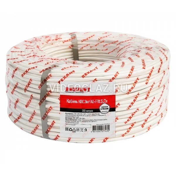 Огнестойкий безгалогенный кабель в экране REXANT Кабель КПСЭнг(А)-FRLSLTx 2x2x1,00мм² 200м (01-4939-1). Не распространяющий горение при групповой прокладке и не выделяющий коррозионно-активных газообразных продуктов при горении и тлении. Кабель состоит из однопроволочного медного проводника, изоляции из огнестойкой керамизирующейся кремнийорганической резины, дренажного медного проводника, экрана из алюминиевой фольги и оболочки из ПВХ пластиката пониженной пожарной опасности с низким дымо- газовыделением и низкой токсичностью. Кабель сохраняет работоспособность в условиях пожара в течение 180 минут. Номинальное напряжение тока до 300 В, частотой 50 Гц.