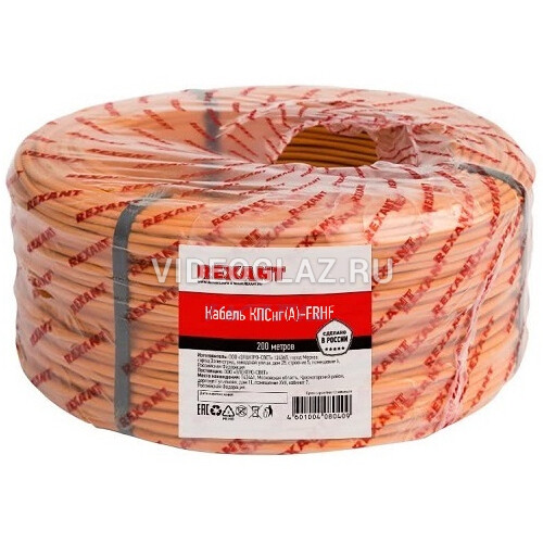 Безгалогенный огнестойкий симметричный кабель парной скрутки REXANT Кабель КПСнг(А)-FRHF 2x2x0,50мм² 200м (01-4923), не распространяющий горение при групповой прокладке и не выделяющий коррозионно-активных газообразных продуктов при горении и тлении. Состоит из однопроволочного медного проводника, изоляции из огнестойкой керамизирующейся кремнийорганической резины, дренажного медного проводника и оболочки из ПВХ пластиката, не содержащей галогенов. Кабель сохраняет работоспособность в условиях пожара в течение 180 минут. Номинальное напряжение тока до 300 В, частотой 50 Гц. Рабочая температура: –40...+70 °С. Температура прокладки: –10…+50 °С. Цвет оболочки кабеля — оранжевый.