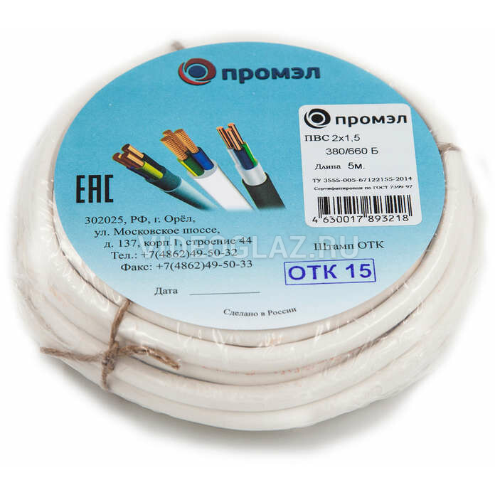 Технические характеристики Провод ПВС 2х1.5 Б (бухта 5м) (шт) Промэл 13321480