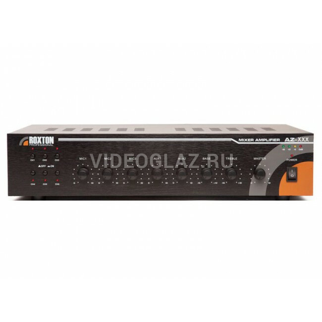 Трансляционный усилитель ROXTON AZ-650 со встроенным селектором на 6 зон трансляции. Кнопочный селектор со светодиодной индикацией выбранных зон на передней стенке усилителя дает возможность вести выборочную трансляцию на любую зону (помещение или группу помещений) предприятия или территории. Возможно включение любой зоны по отдельности, группы зон или всех зон одновременно. Достаточно большая мощность усилителя дает возможность создать систему трансляции и громкой голосовой связи на достаточно больших объектах, таких, например, как учебное заведение, предприятие торговли, офисное здание или открытые территории. К усилителю подключаются трансляционные акустические системы (любого исполнения - настенные, потолочные, рупорные и проч.) с входным напряжением 100/70В. Суммарная мощность подключаемых громкоговорителей (на все зоны вместе) не должна превышать мощность усилителя (650 Вт). При использовании низкоомных акустических систем используется выход усилителя 4 Ом (не допускается одновременное использование выхода 100В и 4 Ом). В качестве источников сигнала можно использовать до трех ручных или настольных динамических микрофонов и 2 любых устройства с линейным уровнем сигнала на выходе (проигрыватели CD/MP3 дисков, радио-тюнеры, звуковые карты ПК, цифровые магнитофоны). Для каждого микрофонного и линейного входа усилителя на передней панели предусмотрен отдельный регулятор уровня. Для подключения устройства записи или другого стороннего оборудования предусмотрен линейный выход. Общая громкость и уровень низких и высоких частот подстраиваются регуляторами на передней стенке. Устройство питается от сети переменного тока 220 В.